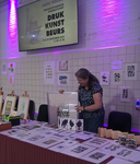 - Margedrukkers, grafici en andere kunstenaars bieden hun uitgaven en druksels aan, gedrukt o.a. op oude persen met vaak historische loden en houten letters. Daarnaast zijn er (druk)demonstraties en zijn er boeken, papier en drukkers- en kunstenaarsbenodigdheden te koop. Foto gemaakt door R.J.J Over de Linden, beurs van 2022