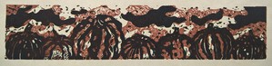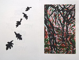 2018Tweede en derde pagina van een gevouwen boekje, met envelop. Linosnede in drie kleuren afgedrukt. Gevouwen boekje 19 x 13 cm (gesloten en in een mapje), 16 x 22 (open zoals op foto hieronder).